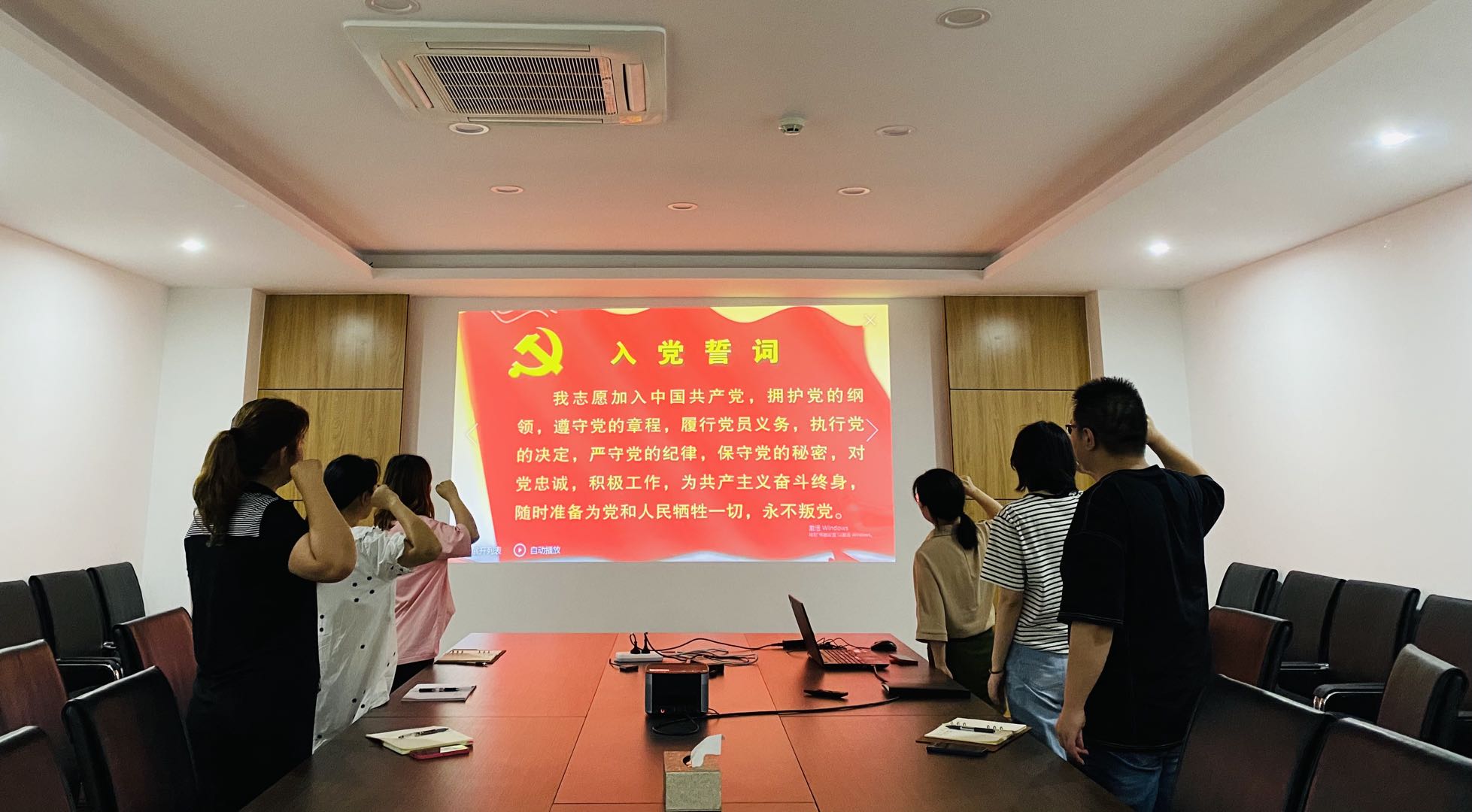 在鮮紅熱烈的黨旗的見證下,易測(cè)黨員們整齊列隊(duì)、神色莊嚴(yán),高舉右拳,重溫入黨誓詞。他們以鏗鏘有力的誓言表達(dá)了對(duì)黨的衷心,體會(huì)到作為一名共產(chǎn)黨員應(yīng)盡的責(zé)任感及使命感。